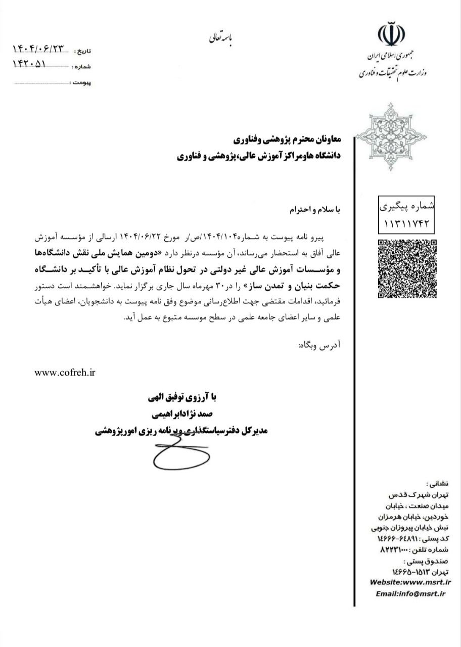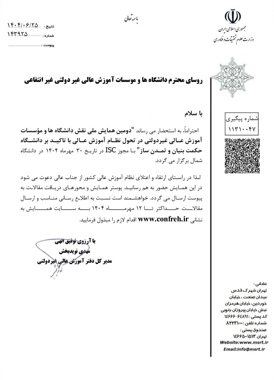 دومین همایش ملی نقش دانشگاه ها و موسسات آموزش عالی غیردولتی در تحول نظام آموزش عالی با تاکید بر دانشگاه حکمت بنیان و تمدن ساز